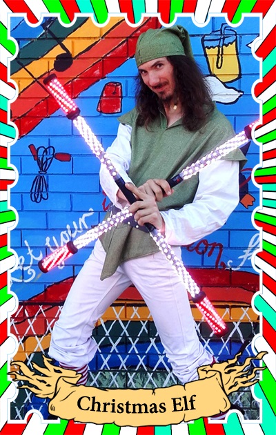 This elf can ‘sleigh’ boredom with a few simple circus tricks and a smile! Twirling with Christmas coloured LED lights including staves, poi, juggling balls and S shaped staves along with silver and clear baubles all the while wishing patrons happy holidays and letting kids know to be on their best behavior!